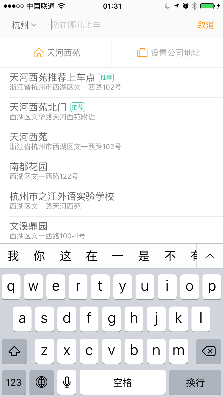 老大选了快车,输入目的地。我注意到他并没有设置“家”和“公司”,所以他必须手动输入地址。其实一开始他点错了,选的是上车地点,但他并没有意识到。