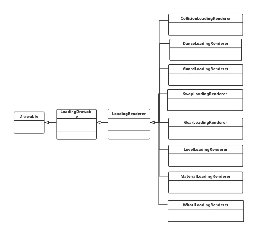 LoadingDrawable是继承自Drawable的并且实现了Animatable接口,Drawable简单的来说就是可以通过Canvas来绘制出图形或者图像的类。通俗的抽象就是:一些能被画出来的东西。想必大家也都很熟悉了。对于Animatable来说,其实就是Android提供给需要实现动画的Drawable需要实现的接口,它分别有start()、stop()和isRunning()方法很显然应该是控制动画的开始和停止。