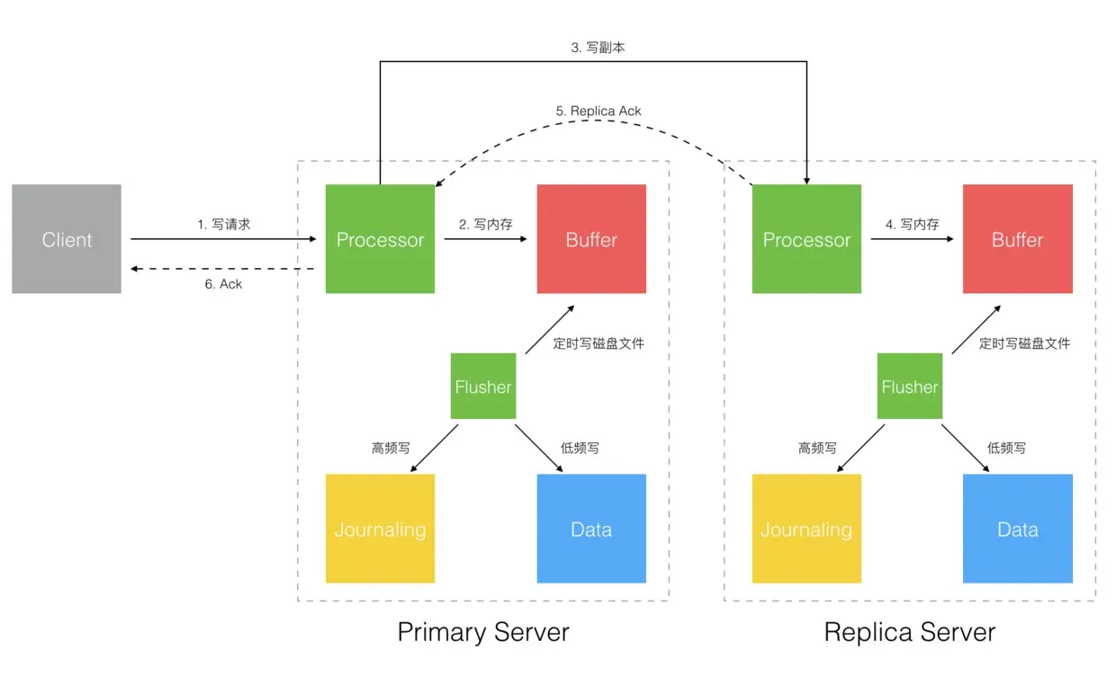 这个模式是针对多副本集的,为了提升数据安全性,除了及时写入磁盘也可以通过写多个副本来提升。在这个模式下,数据至少写入 2 个副本的内存 Buffer 中才回发 Ack 确认。虽然都在内存 Buffer 中,但两个实例在落盘短暂的 100ms 时差中同时故障的概率很低,所以安全性有所提升。