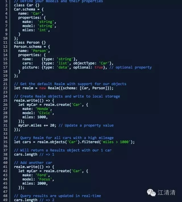 以上是官方一个最基础的实例,我们知道:Realm React Native可以让我们以安全,持续,快速的方式高效编写我们的应用模型层,可以看一下官方的一个例子代码来演示一下模型处理一些其他使用的基础方法: