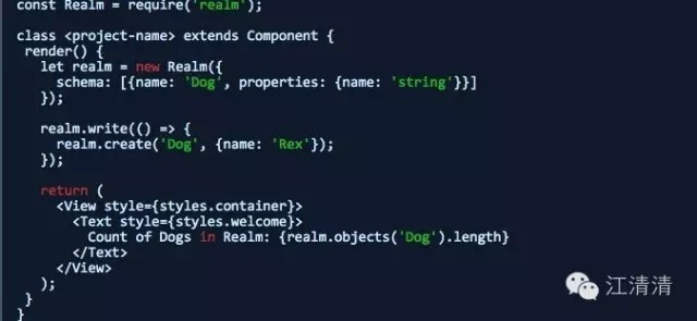 完成了以上几个步骤,接下来我们需要使用Realm了,下面我们在创建的项目中的index.ios.js或者index.android.js文件中添加以下部分代码,进行运行查看相关效果。