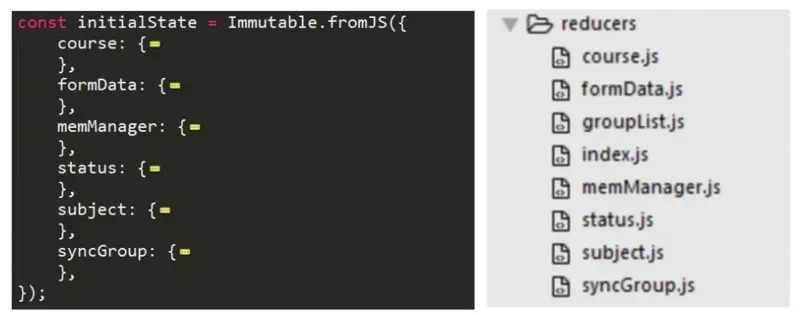 在重构的时候,我们倾向于将功能类似的数据归类到一起,并建立对应的reducer文件对数据进行处理。如下图,是手Q家校群布置页的数据结构。有些大型的SPA项目可能会将初始数据分开在不同的reducer文件里,但这里我们倾向于归到一个store文件,这样能够清晰地知道整个文件的数据结构,也符合Redux想统一管理数据的想法。然后数据的每个层级与reducer文件都是一一对应的关系。