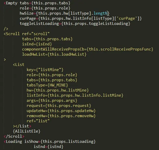 先上一下列表页的代码,如下图。这里当时是学习了PC家校群的做法,将component作为props传入。这里的封装的是滚动检测的逻辑,而则是列表页的渲染,是列表为空的时候展示的内容,是列表底部加载的显示横条。