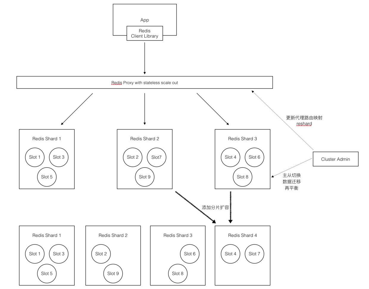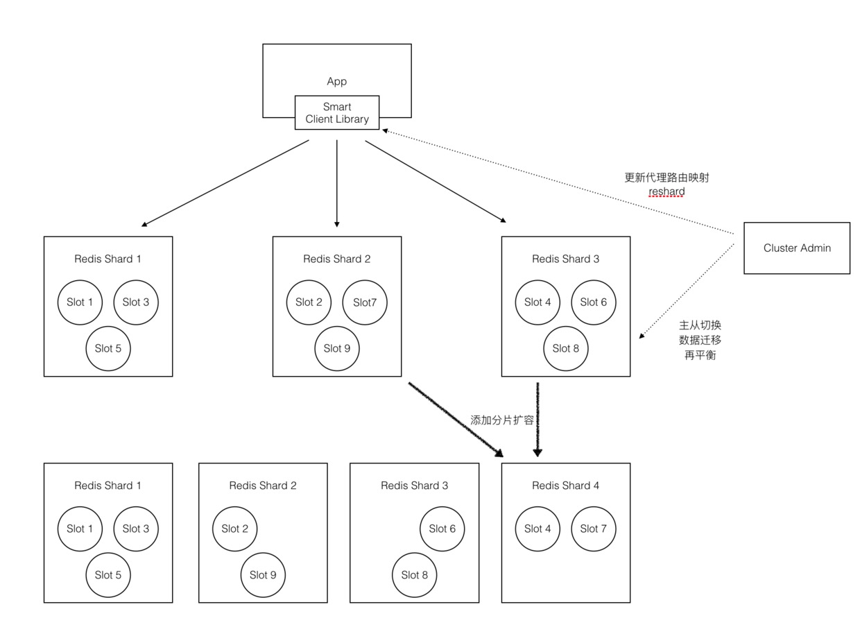 Redis 中的 key 按 Slot 来组织,平滑扩容时比如加分片后,按 Slot 为单位迁移,这通常需要改造 Redis 源码来支持。这个模式的架构示意图如下所示。
