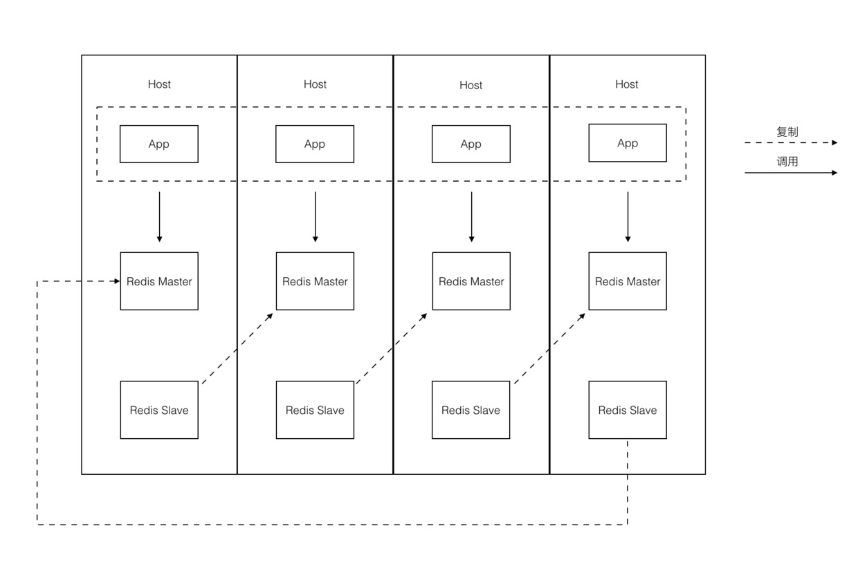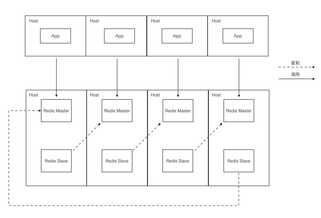 一台 PC Server 的硬件可靠性大约是 99.9%,Redis 作为一个应用全局共享的关键服务分成 10 片放在十台 PC Server 上。实际上导致整体系统可靠性还降低了一个量级,变成了两个 9。因为任何一台 PC Server 挂了都可能导致全局系统故障。然而当初没有多余的机器资源,为了提高可靠性,必须对 Redis 做主备,唯一的办法就是交叉主备,所以部署结构大概类似下面这样。