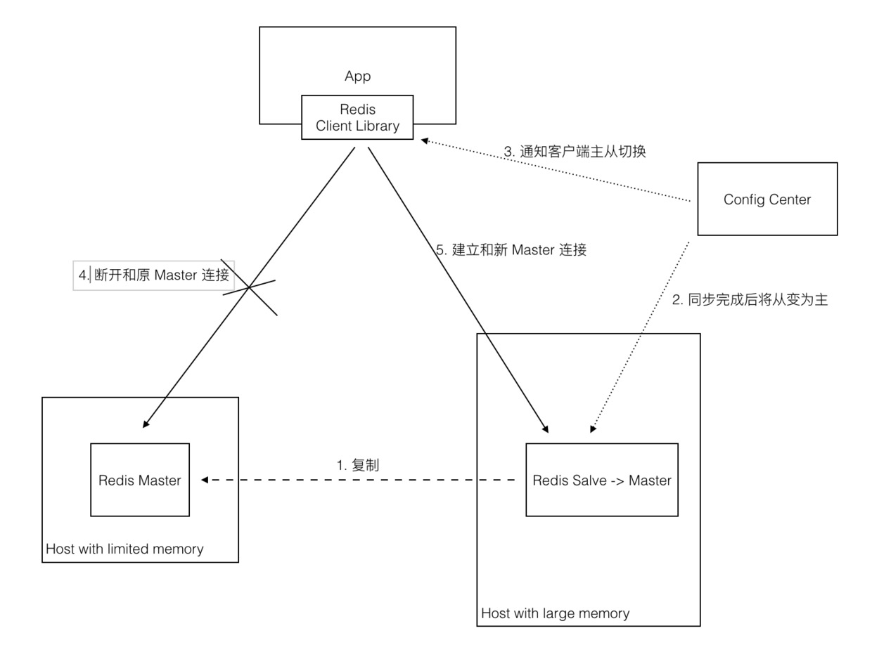 这样每个 Redis 实例能分到的内存是小于 8G 的(还要给系统留一点不是)。随着业务发展,一开始是 2G,很快 4G 然后 6G 就到了单机内存瓶颈,下一步只能分一个实例出去,每个实例独享单机内存。纵向扩容在操作性上是最简单的,在另外一台机器上先挂一个从分片,同步复制完成后,通知 Client 端切换连接而分片 Hash 规则还是不变。这个过程会有短暂的(下图 2-5 步这个过程程序执行的时间窗口)写丢失,在业务上是可接受的。