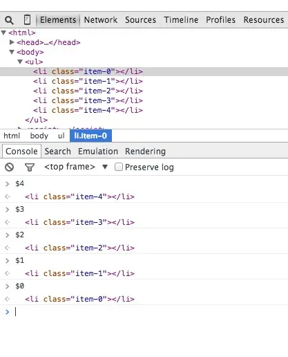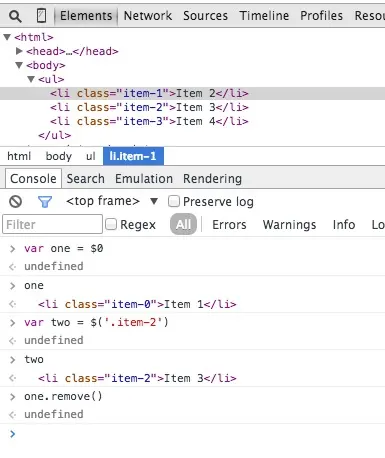 在Elements选择面板中选择某个DOM元素然后在Console中使用该元素也是非常常见的一个操作,Chrome Inspector会缓存最后5个DOM元素在它的历史记录中,你可以用类似于Shell中的$0等方式来快速关联到元素。譬如下图的列表中有‘item-4′, ‘item-3’, ‘item-2’, ‘item-1’, ‘item-0’这几个元素,你可以这么使用:
