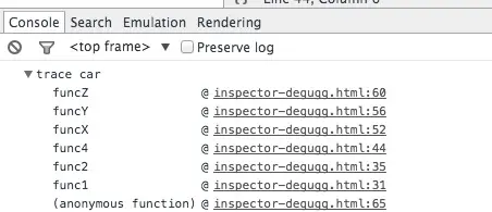 JavaScript框架极大方便了我们的开发,但是也会带来大量的预定义的函数,譬如创建View的、绑定事件的等等,这样我们就不容易追踪我们自定义函数的调用过程了。虽然JavaScript不是一个非常严谨的语言,有时候很难搞清楚到底发生了啥,特别是当你需要审阅其他人的代码的时候。这时候console.trace就要起作用咯,它可以帮你进行函数调用的追踪。譬如下面的代码中我们要追踪出car对象中对于funcZ的调用过程: