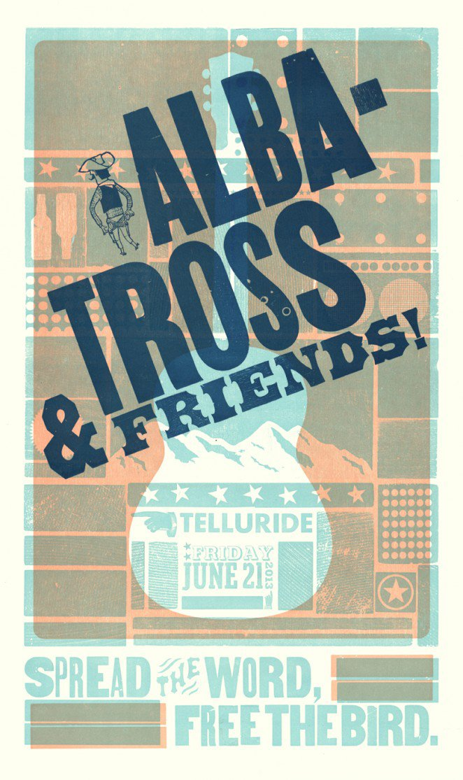 在下面的设计中, Brad Vetter为了演出而设计的凸版印刷海报中背景显示了两种类似光照的柔和色调。与之相对比,深海军蓝被用来强调标题——出演的艺术家。