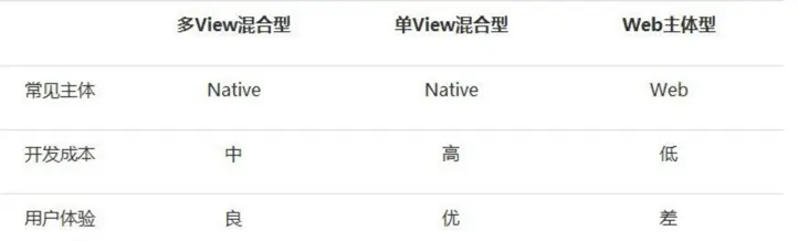 Hybrid App按网页语言与程序语言的混合,通常分为三种类型:多View混合型,单View混合型,Web主体型,3种类型比较如下: