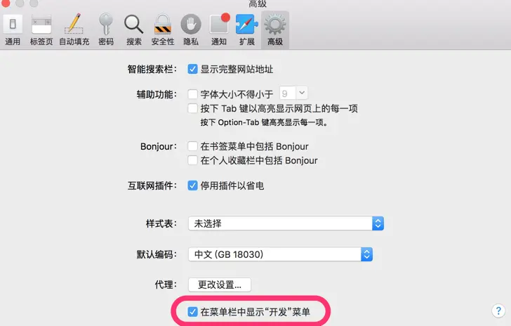 2.打开Mac上的Safari,选择“偏好设置” - “高级” - "在菜单栏中显示“开发”菜单"