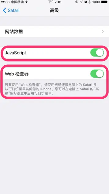 1.首先iPhone连接上Mac,点击信任,确保itunes连接成功,然后打开iPhone的“设置” - “Safari” - "高级" - 打开“JavaScript” 和 “Web检查器”