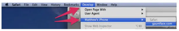3.打开iPhone上的Safari或者运行PhoneGap程序,到某一个界面,回到Mac上的Safari上,选择“开发”,然后选择你的iPhone,就可以查看到那个一个Web界面了