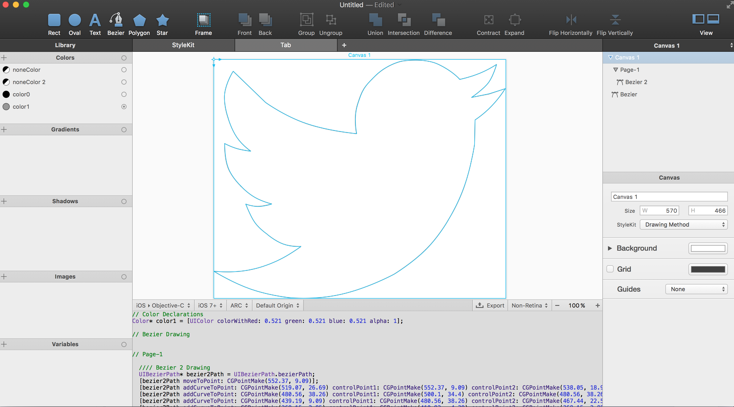最后PaintCode就是把路径转换成UIBezierPath(PaintCode这个软件很厉害,可以直接把SVG里面的路径直接转换成对应的Swift或者Objective-C代码)(后来我发现其实只要用PaintCode一个软件就可以完成上面所有功能了,它也可以直接用钢笔工具画路径)