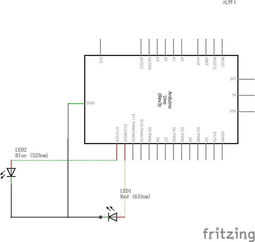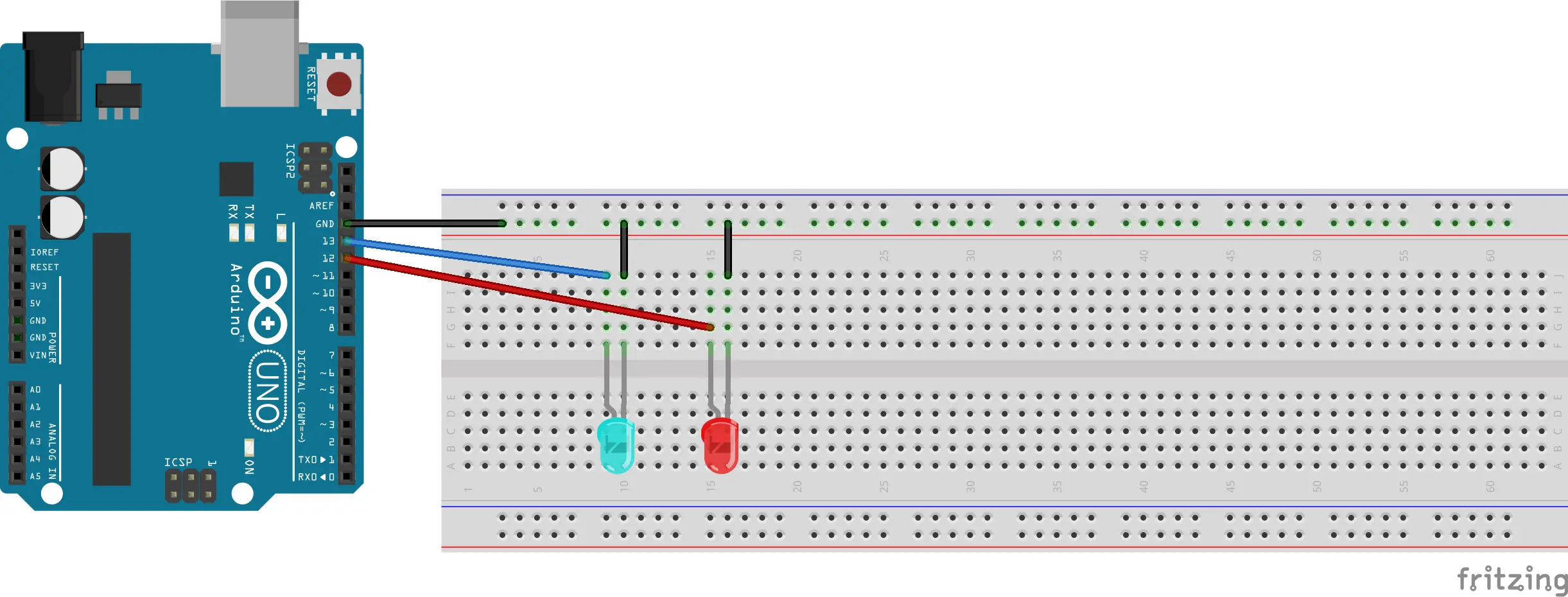没啥好设计的,就是把他们分别连接到分别连接Arduino两个引脚上,为了防止电流过大,保护我这LED灯,减少财产损失,我给其中一个加了一个电阻,另外一个连接到自带电阻的引脚上了。为了体现我装逼的专业感,我特意用一款比较简易NB的电路设计软件:fritzing,给大家设计如下电路连接示意图结构:
