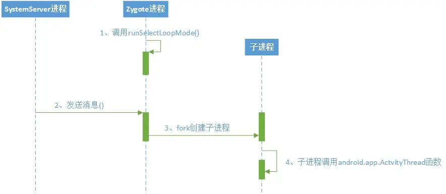 zygote孵化出第一个进程system_server,通过runSelectLoopMode等待并处理消息,分裂仍由system_server控制,如app启动时创建子进程