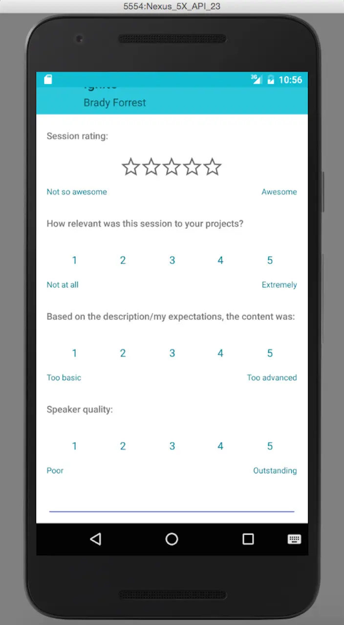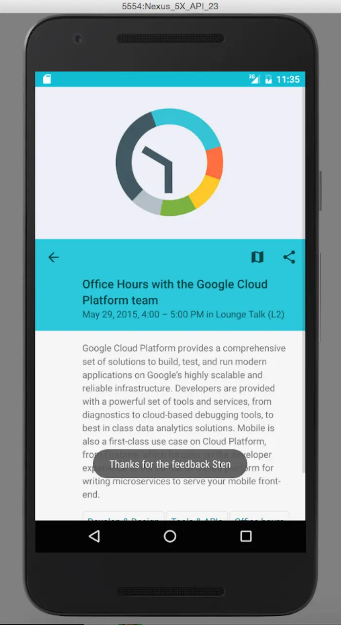 现在让我们在应用上做一个简单的功能改动。针对于GoogleIO中每一个举行的子会场你都可以发送反馈问卷,我们给这个问卷添加多一个输入框输入你的姓名,当你完成反馈的时候会弹出Toast来感谢你的反馈。