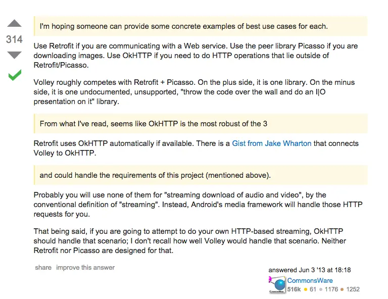 当前的网络开源库有许多,如volley,okhttp,retrofit等,这三个库当前是比较火的,其中,okhttp和retrofit由square团队开发。关于这三个库的区别,请移步stackoverflow或者知乎查看。开发过程中选择什么样的开源库需要更具我们APP来做出选择。我们选出stackoverflow中的一段话来看下。