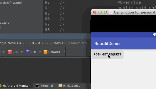 然后利用http接口的方法生成Call对象,最后用Call对象来执行http请求(异步和同步,后面会说到)。别忘记添加权限。