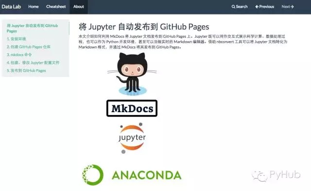 本文介绍如何利用 MkDocs 将 Jupyter 文档发布到 GitHub Pages 上。Jupyter 既可以用作交互式展示科学计算、数据处理过程,也可以作为 Python 开发环境,甚至可以当做实时的 Markdown 编辑器。借助 nbconvert 工具可以将 Jupyter 文档转化为 Markdown 格式,并通过 MkDocs 将其发布到 GitHub Pages。
