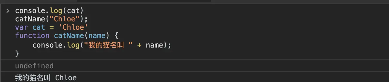 - 首先执行var cat = undefined和function catName(){}