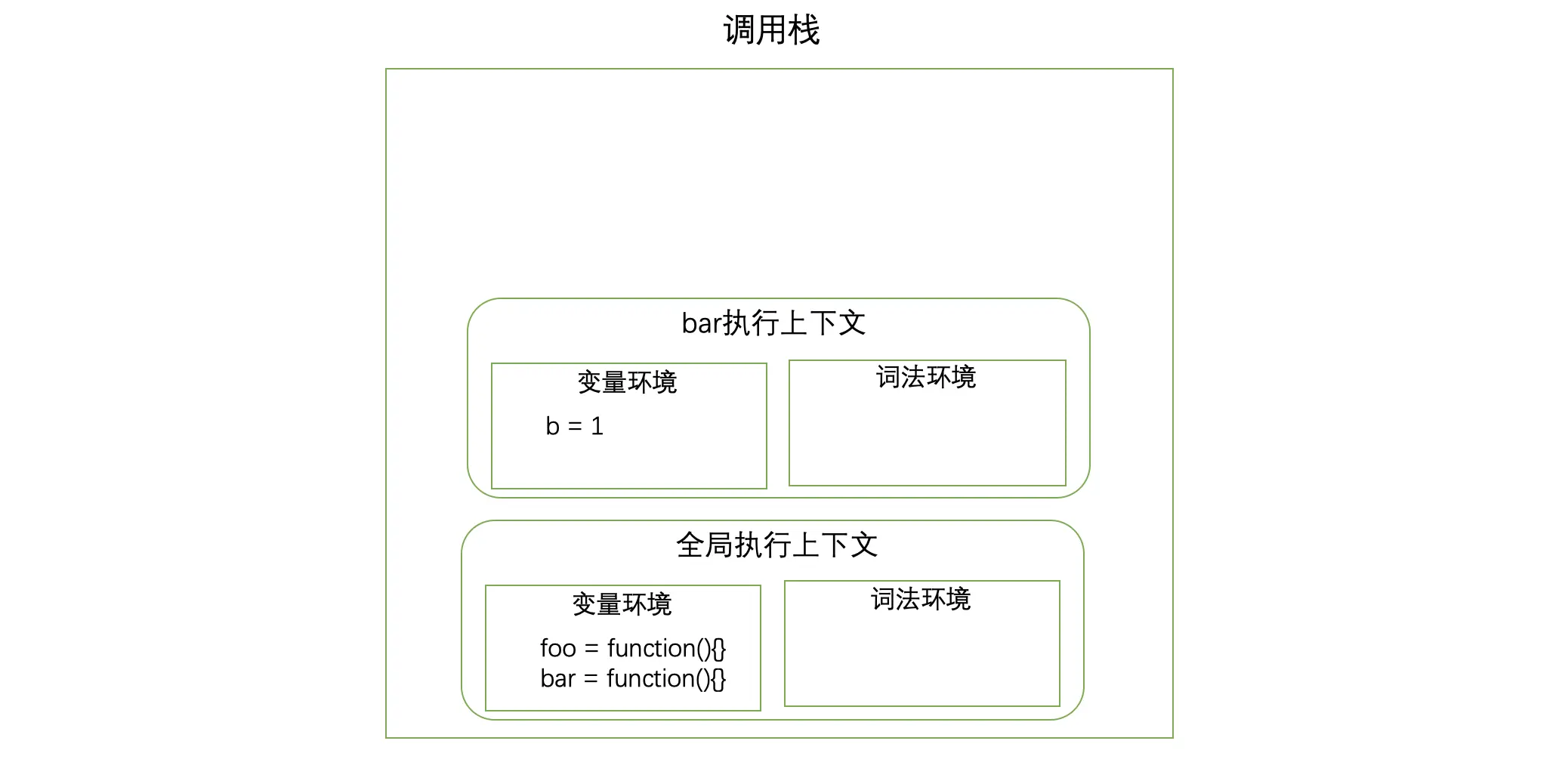 5、执行完bar函数后,调用栈就将其执行上下文从栈顶弹出。剩下全局执行上下文