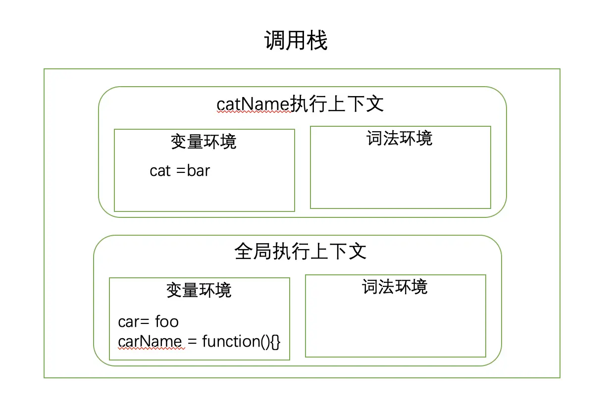 - 创建catName执行上下文时,JavaScript引擎会将var变量声明cat提升内容放在变量环境中,赋予默认值undefined。