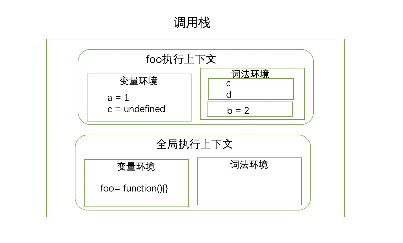 - 执行到catName内部的console.log(cat)时,在catName执行上下文中的变量环境找到了cat的值,输出undefined。