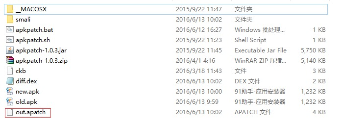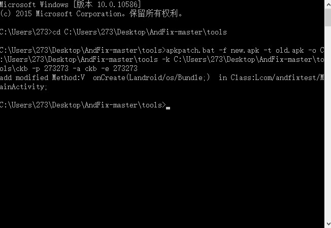 在cmd下输入 apkpatch.bat -f new.apk -t old.apk -o xxx -k xxx -p xxx -a ckb -e xxx