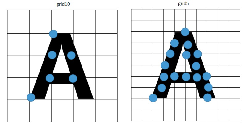 这里用到了gridX和gridY,它们的作用是来判断每个多少个距离取一次数据。学过信号抽样的同学应该很好理解,如果你间隔大,抽样得到的数据就小,反之如果你设定的间隔小,那么抽到的数据就多。在我们的效果中,我们绘制的是文字,同样的道理,间隔小获取的数据就多,粒子就多,组成的文字就完整。间隔大获取的就少。那么粒子组成的文字就不那么完整,这两个变量的值,通过分辨率控件来绑定。思来想去还是上张图吧!