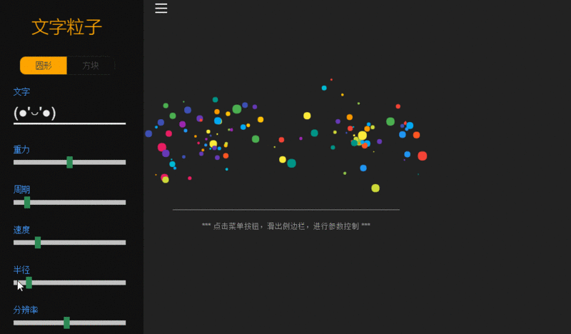 在侧边栏中有一系列的控制条,他们控制着粒子的各种属性,包括文字输入框:
