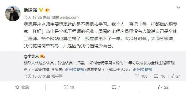 事实上除了李老师故意曲解全栈工程师以此来激起争论,李老师的观点还是非常之棒,在2011年学习Android那会,我遇到不少同学努力学了一个暑假,最后顺利拿到阿里和人人等大公司的offer,但是在后续的工作中大家都明白自己的缺陷,经常加班学习到夜里12点弥补,即便这样过了四五年,大家也都只是敢说Android方面算是有点心得,对于编程语言会有更深层次的理解,更加容易上手某一个语言,但是也还绝不敢说自个就有全栈的潜力了!