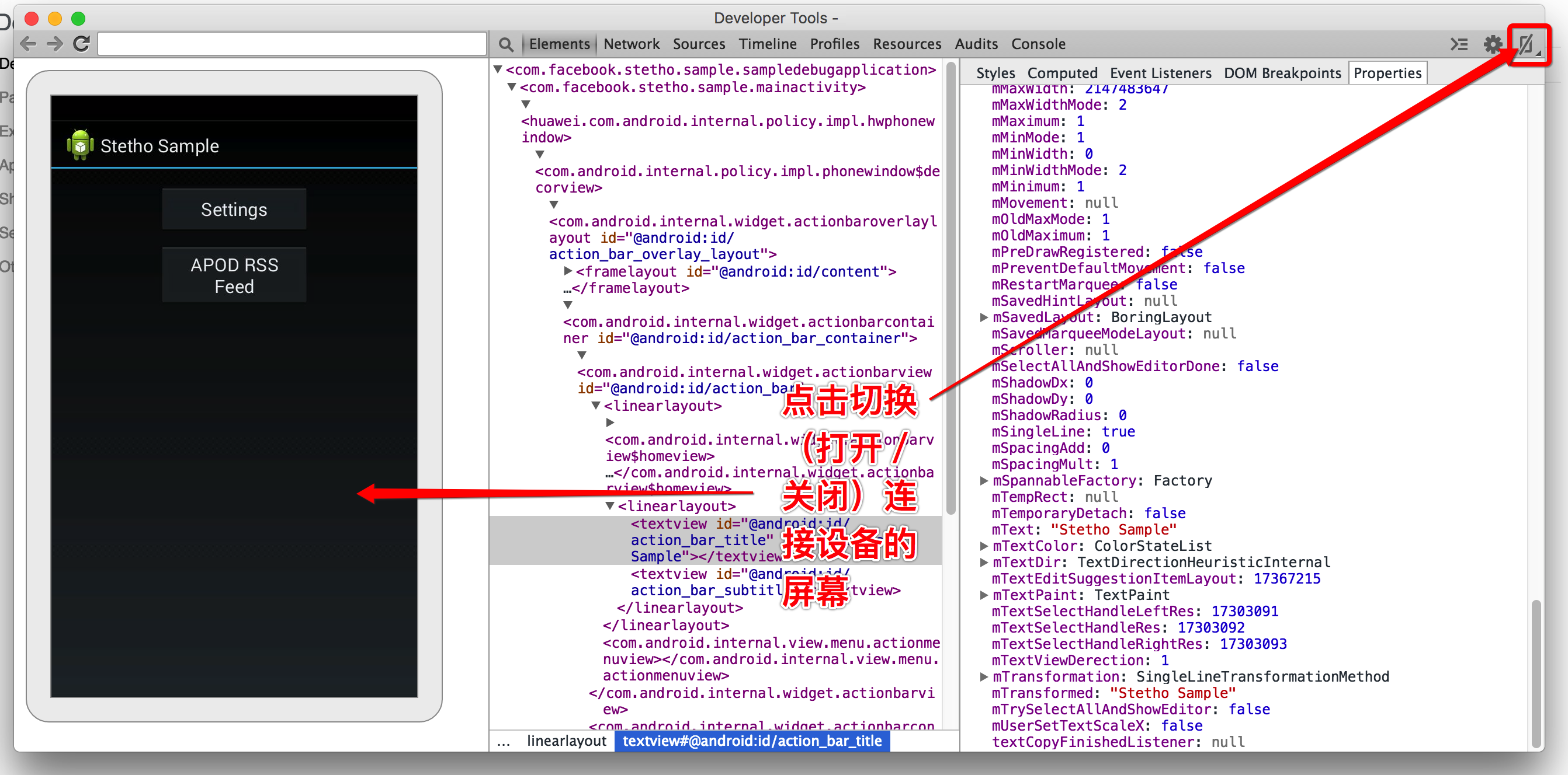 - 首先看功能导航条的第一个tab,叫做”Elements”,工作区中的内容是不是很熟悉,Hierarchy Viewer,很像吧,点击具体的xml节点,可以看到连接的手机上对应的UI控件高亮显示了,这个可以像Hierarchy Viewer那样分析APP页面的嵌套层级