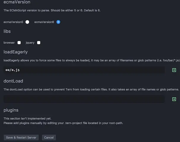 Save & Restart server 之后会在项目根目录生成 .tern-project 文件,该配置文件里常用字段: