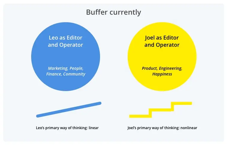 For example, I thrive on executing projects and getting results, while Joel’s strengths are in deep-thinking and problem solving. This led to our editor/operator model: