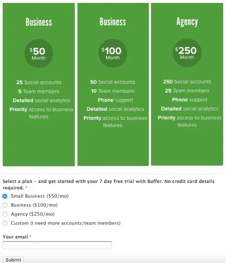 It’s still a bit embarrassing to think back to how we did it. This was our first pricing page of that product – it was literally a Wufoo page where people selected a plan, gave us their email and we would then by hand start a trial and get them setup.