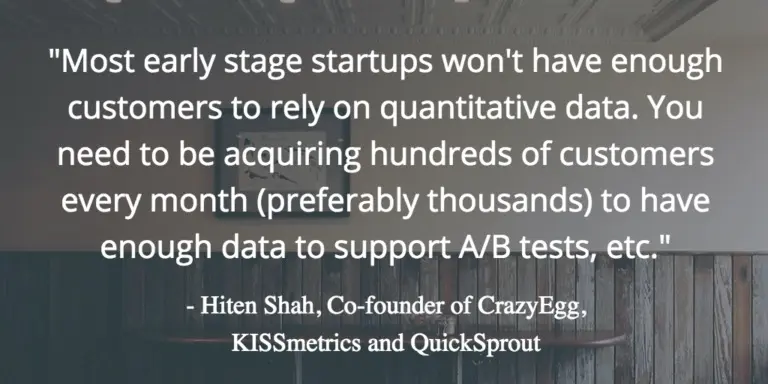 “Most early stage startups won’t have enough customers to rely on quantitative data. You need to be acquiring hundreds of customers every month (preferably thousands) to have enough data to support A/B tests, etc.”