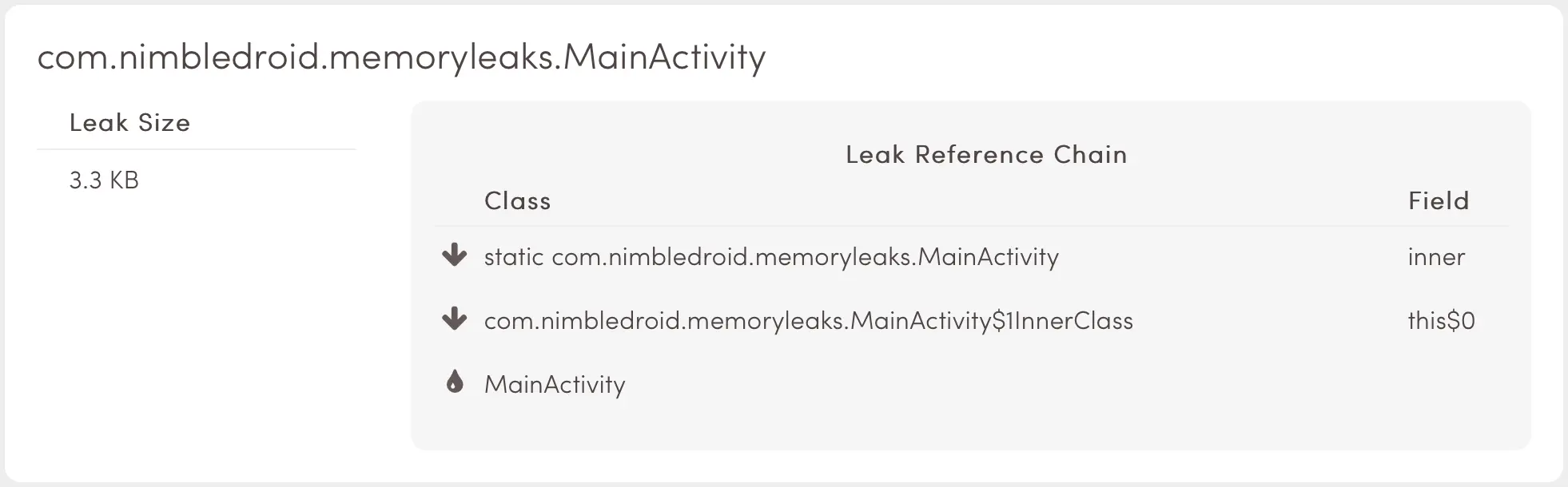 现在你已经见识了这么多内存泄漏的情况,一不留神就泄漏大量内存实在是太容易发生了。记住,尽管最严重的内存泄漏情况才会造成应用内存溢出并崩溃,但并不总会发生这样的情况,取而代之的是,这将浪费应用大量内存空间。在这种情况下,应用给其他对象的可分配内存就少了,然后你的 GC 就不得不时常为新对象释放空间。GC 是代价很大的操作并会让用户感到速度下降。当你在 Activity 中初始化对象的时候,留心潜在的引用链,并且经常测试内存泄漏!