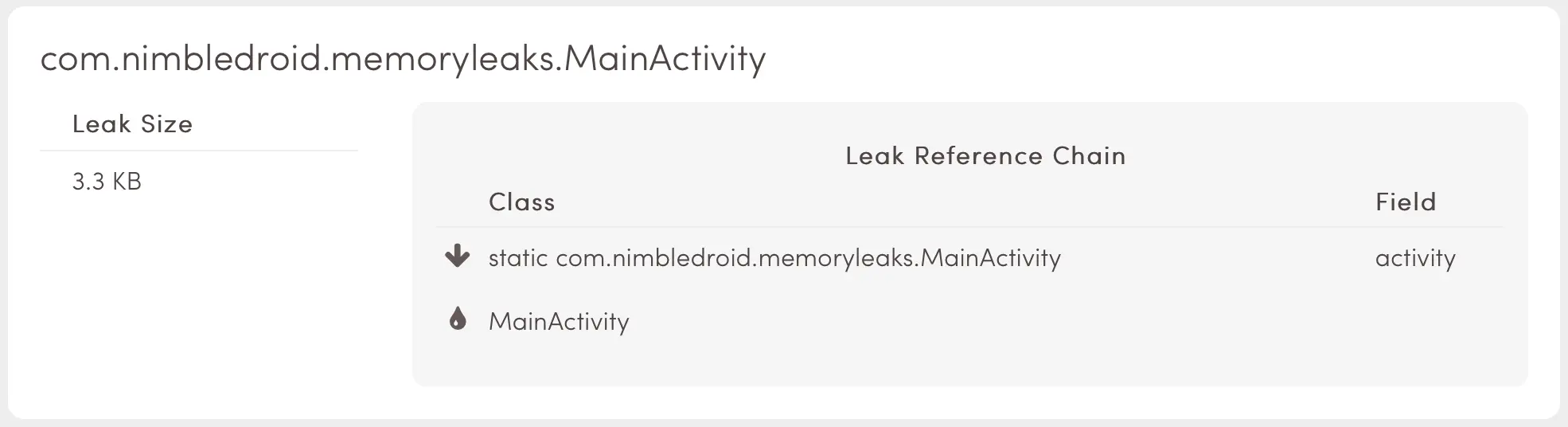 泄漏一个 Activity 最简单的方法是:定义 Activity 时在内部定义一个静态变量,并将其值设置为处于运行状态的 Activity 。如果在 Activity 生命周期结束时没有清除引用的话,这个 Activity 就会泄漏。这是因为这个对象表示这个 Activity 类(比如:MainActivity )是静态的并且在内存中一直保持加载状态。如果这个类对象持有了对 Activity 实例的引用,就不会被选中进行 GC 了。