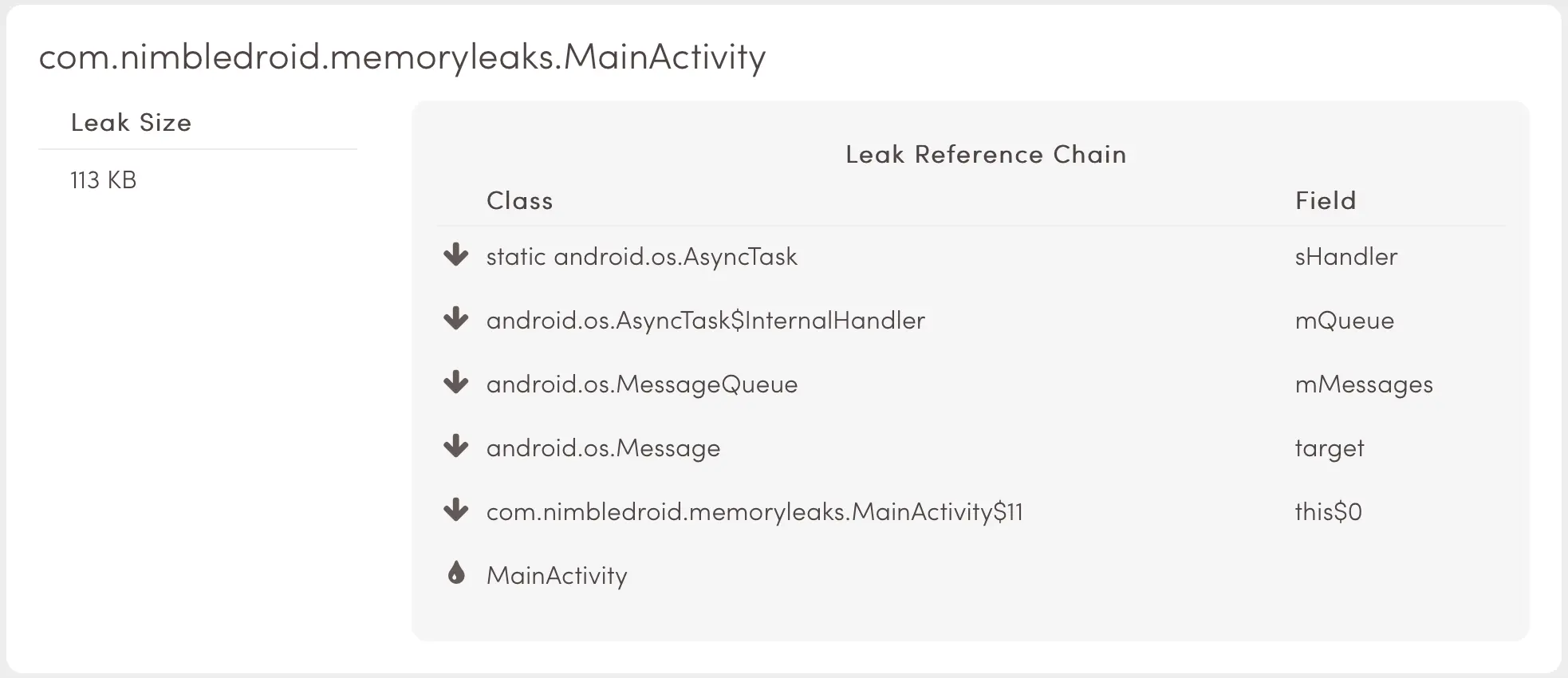 相同的情况同样适用于这样的后台任务:被一个 Runnable 对象定义并被一个 Handler 对象加入执行队列。这个 Runnable 对象将会含蓄地引用定义它的 Activity 然后会作为 Message 提交到 Handler 的 MessageQueue(消息队列)。只要 Activity 销毁前消息还没有被处理,那么引用链就会使 Activity 保留在内存里并导致泄漏。