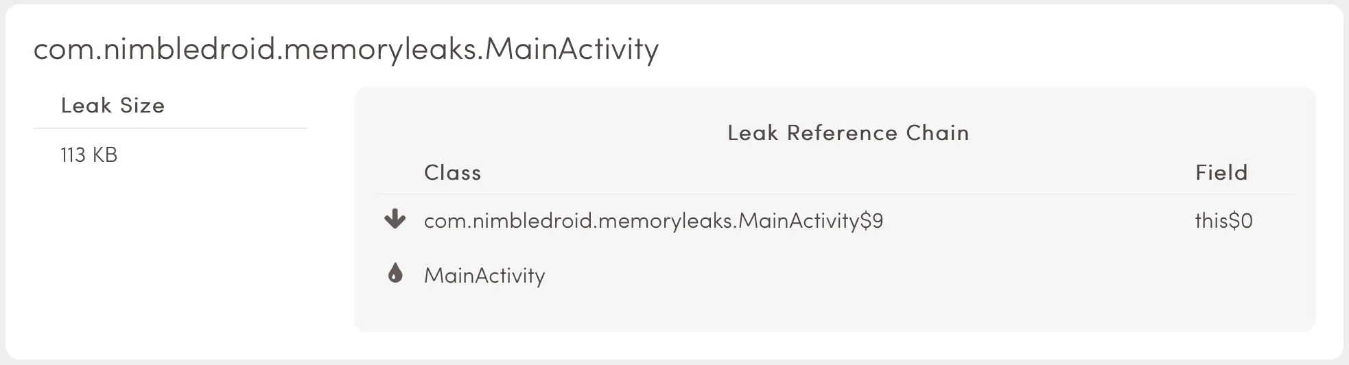 稍等,有一点奇怪的地方。正如你知道的,在这种情况下,我们的 Activity 中,一个被附加的 View 会持有对它的 Context 的引用。通过使用一个 View 的静态引用,我们给 Activity 设定了一个持久化的引用链并且泄露了它。不要使附加的 View 静态化,如果你必须这么做的话,至少让它们在 Activity 完成之前从 View 层级关系的同一点上分离出来。