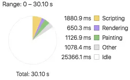 有意思的是,Chrome 的开发工具在获取 Vue 的 500 场比赛测试结果的 30s 时间线时崩溃了,但 React 的 500 场比赛测试却没有。我们截取了 15s 的结果以取代它,但是让人不解的是,Vue 相比于 React,其实有更多的空闲时间。