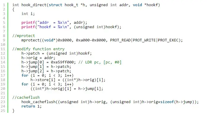 接下来我们看如何修改函数入口(modify function entry),首先我们保存一下原函数的地址和那个函数的前三条指令。随后我们把目标函数的第一条指令修改为 LDR pc, [pc, #0],这条指令的意思是跳转到PC指针所指的地址,由于pc寄存器读出的值实际上是当前指令地址加8,所以我们把后面两处指令都保存为hook函数的地址,这样的话,我们就能控制PC跳转到hook函数的地址了。