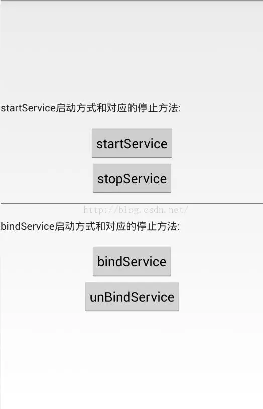 我们先在Activity中加入两组四个按钮,一组为startService的启动按钮和相应的停止按钮;一组为bindService的启动按钮和相应的停止按钮。如图: