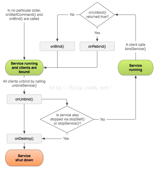 从上面的打印日志可以看到,两种启动Service方式走的生命周期方法是不同的,官方的生命周期图很好地描述了两种启动方式下的回调: