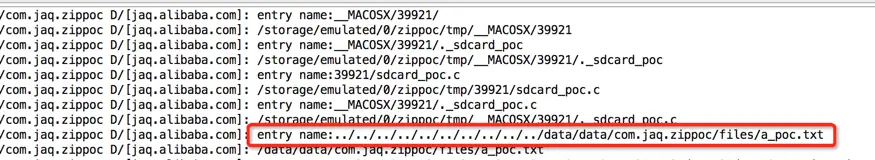 此ZIP文件存放在SD卡中,想让解压出来的所有文件也存在SD卡中,但是a_poc.txt文件却存在了应用的数据目录中: