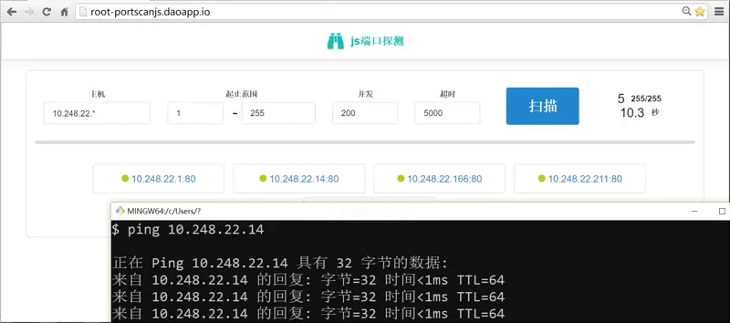 ps.scan('192.168.0.*', 1, 254); // 加端口号也可以 '192.168.0.*:8080'