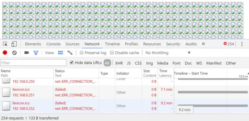 浏览器有几秒的尝试容错时间,对于媒体资源,浏览器限制同一域名并发请求为个位数(一般为 6 个),也就是说,把图片全放到页面上,也不能同时开始检测,只能一点一点来,扫端口的时候会非常慢。