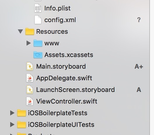 一般来说会把静态资源文件放置到www目录下,这边有一个小点需要注意下(不知道是不是笔者搞错了),就是将www文件夹引入到XCode中的时候,注意不要选择Copy而是File Reference,即最终的文件夹应该是如下图所示的蓝色而不是黄色。