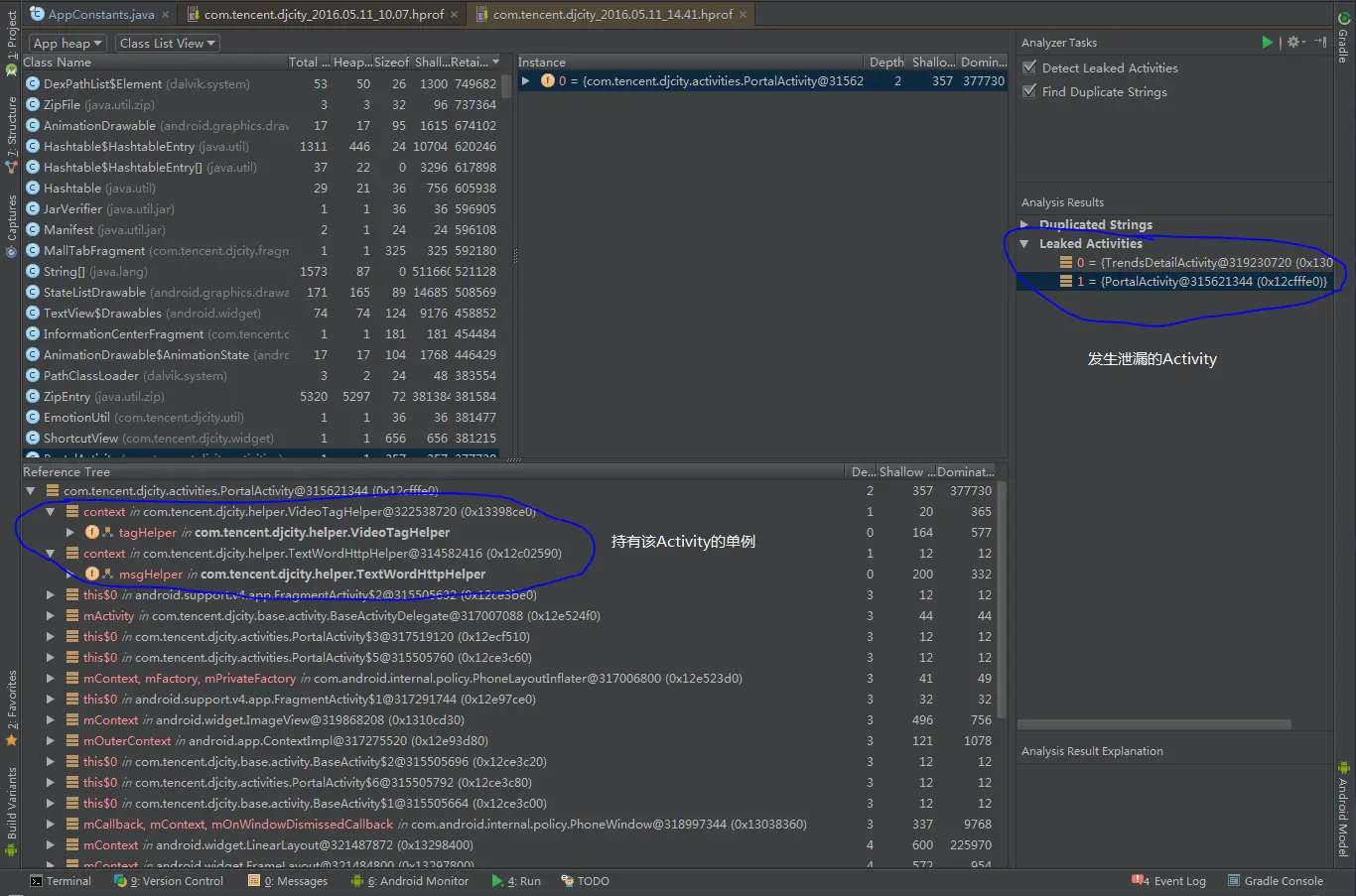 在Reference Tree里面,我们直接就可以看到持有该Activity的单例对象,直接定位到该单例中的代码,发现代码中出现了